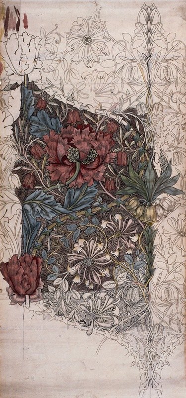 윌리엄 모리스과 아내 제인의 딸인 메이 모리스는 아홉 살 때부터 켈름스콧에서 함께 지냈으며, 현재 왕립예술학교(Royal College of Art)가 된 국립예술훈련학교(National Art Training School)에서 자수 공예를 배워 모리스앤코 Morris & Co.에 합류하였습니다. 이후 메이 모리스는 전통 직물에 대한 연구와 강연을 지속하며 디자인과 수채화 작업에 몰두하였습니다. 그러면서 아버지가 추구한 "기계가 아닌 인간의 섬세함을 믿고 자연을 존중하는 미술공예의 이상"을 딸이 이어나갔습니다.