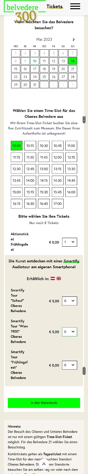 벨베데레 궁전은 상궁과 하궁, 현대미술관 벨베데레21로 나누어져 있고, 주로 클림트의 <키스> 작품이 있는 상궁을 많이들 방문합니다.(그림에 관심 있다면 하궁도 방문 추천). 방문하기 원하는 티켓을 선택한 후 날짜(13일 또는 14일) 및 입장 시간을 선택하고 하단에 입장 인원 수까지 선택합니다.