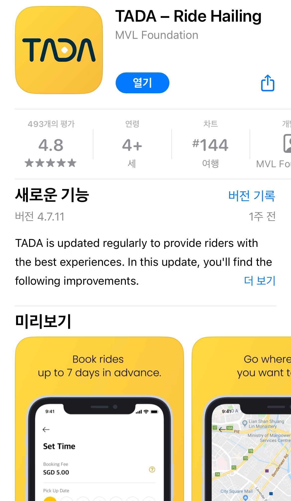 싱가포르에서는 택시보다 타다, 그랩 등이 사용이 더 편리하다고 하는데, 보통 타다TADA가 가장 저렴하다고 합니다