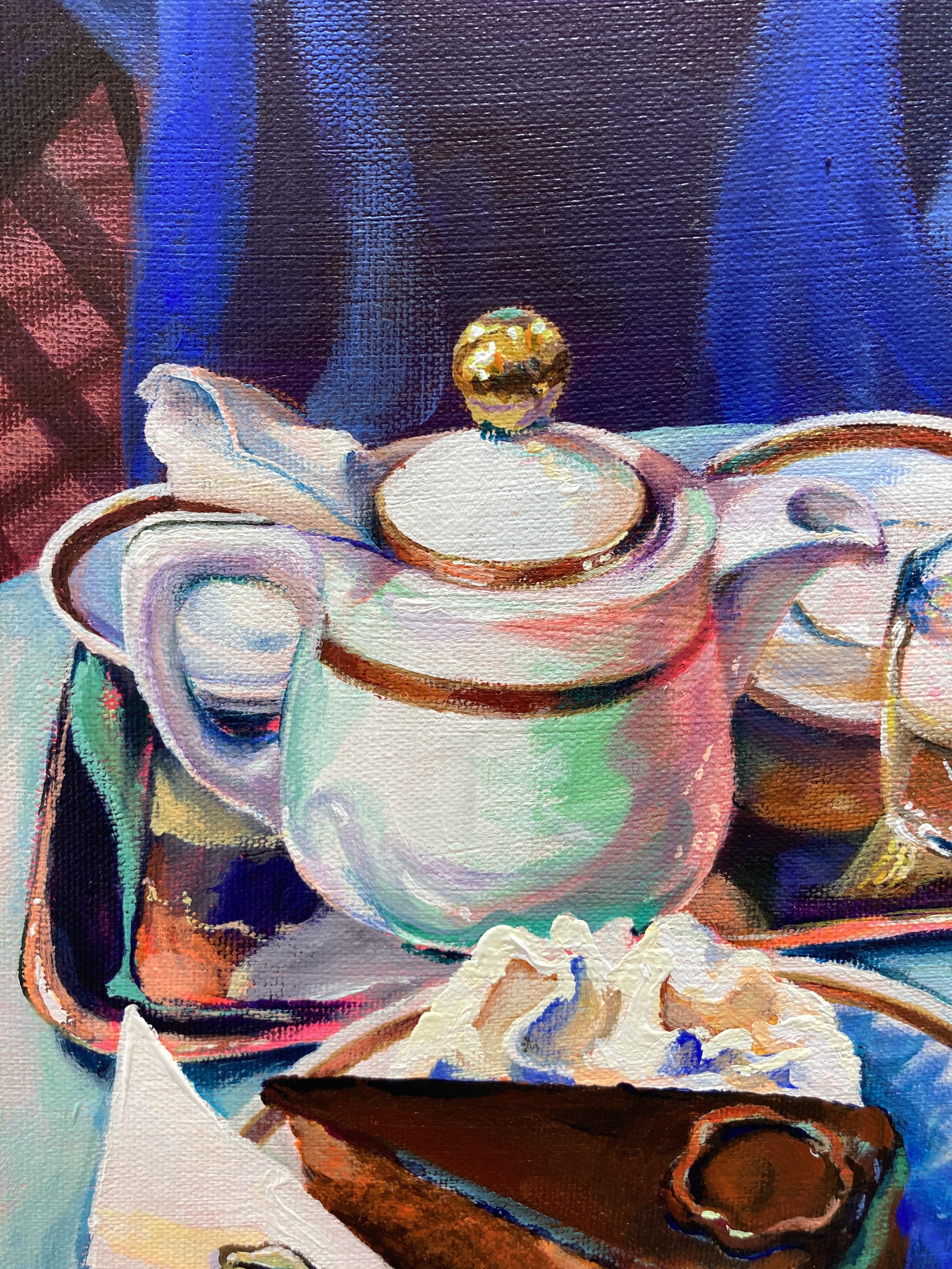 생크림(슐라그, Schlag 당을 첨가하지 않은 휘핑크림)과 함께 서빙되는 살구잼이 들어간 초코케이크와 따뜻한 차 한잔.