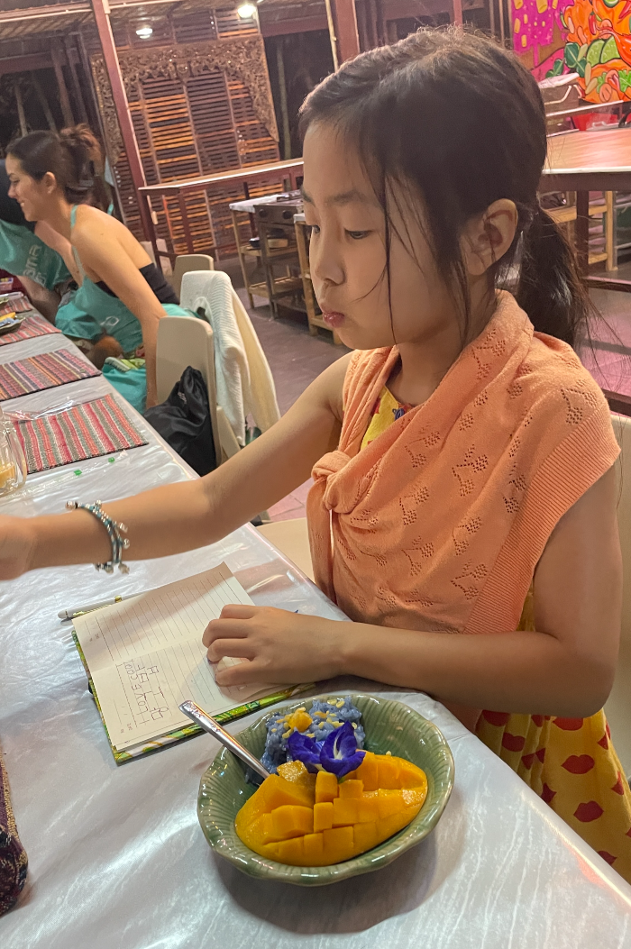 망고 위 보라 꽃을 물에 담그면 파란 물이 나오는데, 코코넛 밀크와 파란 물을 섞어 찰밥을 넣어 볶아주면 보라색 찰밥이 된다. 망고밥까지 시식하면 모든 일정이 끝이 난다.