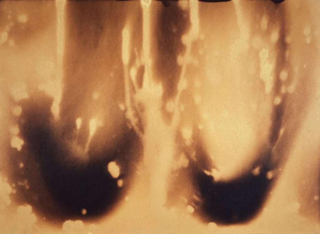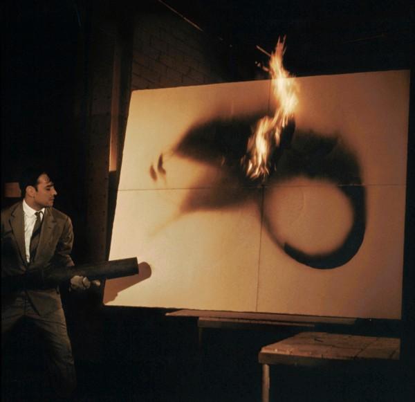 모델들에게 물을 뿌리고 압축된 보드에 몸을 대고 횃불로 그 부분을 훑으며 네거티브 이미지로서 스펙트럼 흔적을 드러내도록 제작하였습니다.