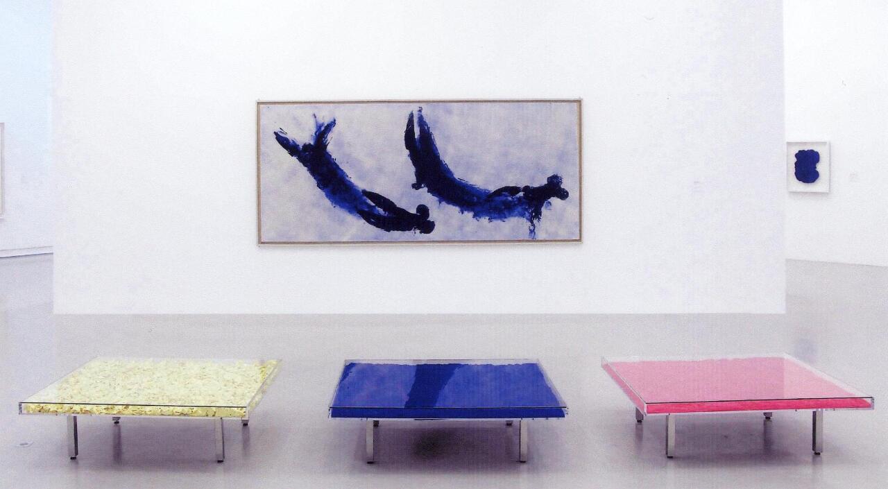 파리의 이리스 클레르 화랑Iris Clert Gallery에서 '텅 빈 전시회The void'를 열기도 했습니다. '텅 빔'(1958)이란 표제의 이 전시회는 화랑의 내부를 온통 하얗게 칠한 다음 텅 비워놓은 것으로 화제를 모았습니다 벨벳 블루 커튼으로 자신의 몸을 가리고 한 번에 10명의 방문객만 입장할 수 있도록 허용했습니다. 아무것도 없어서 인상적인 그의 작품을 보러 온 관람객이 2500명이나 되었습니다.