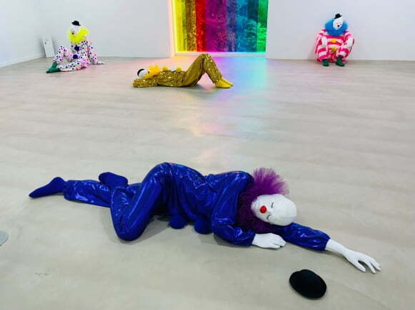 포도 뮤지엄에서 열리고 있는 두 번째 기획전 '그러나 우리가 사랑으로' 전시에는 무지개 앞에서 제각각 다른 포즈로 휴식을 취하고 있는 27명의 광대들이 있습니다. 또 무지개로 꾸며진 '롱 라스트 해피'가 제주 하늘을 배경으로 떠 있습니다.