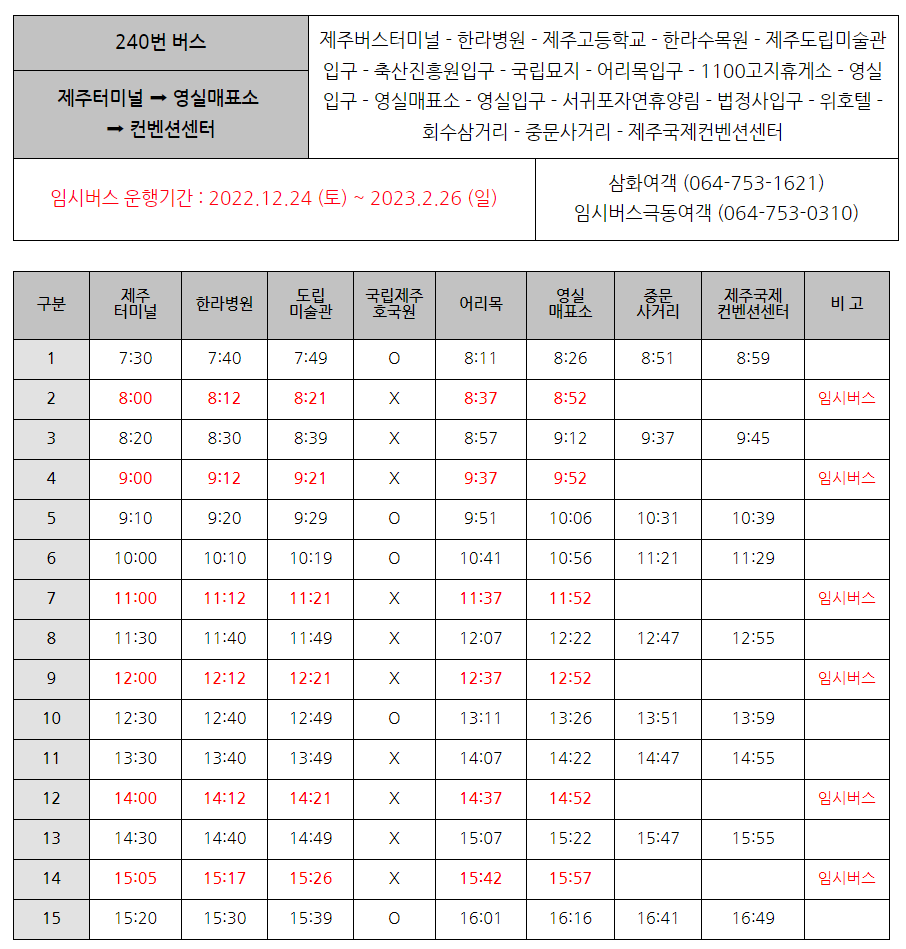 임시버스는 2022.12.24~2023.02.26 기간 중 토, 공휴일만 추가 운행됩니다